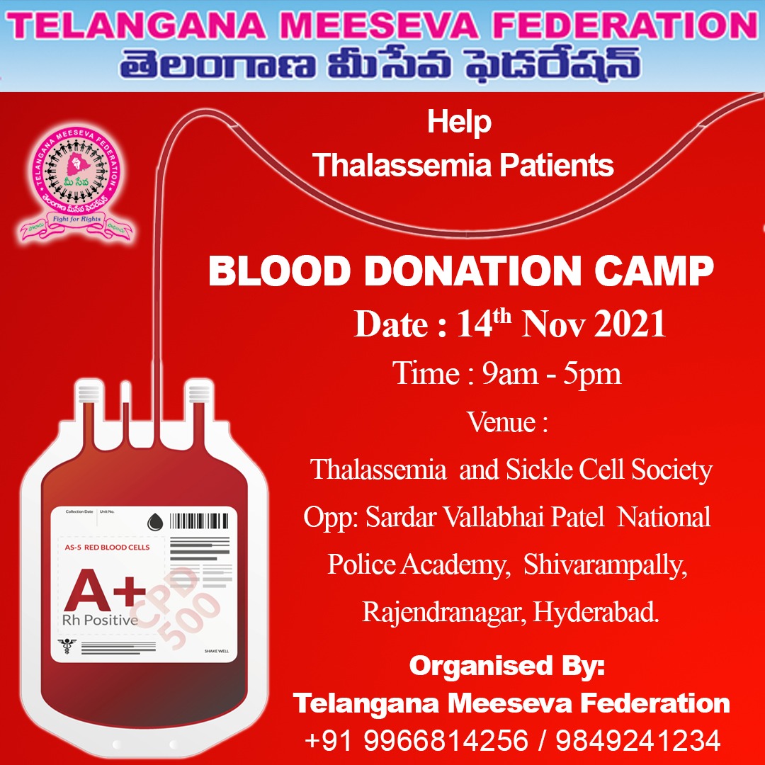 As blood is needed in large quantities to save the life of such children, Telangana Meeseva Federation has decided to conduct a Blood Donation Camp on the occasion of Children's Day i.e. on 14th Nov 2021, to help those children with kind and soulful participation of all MeeSeva Franchisees / Operators / CSC VLEs and also general public.